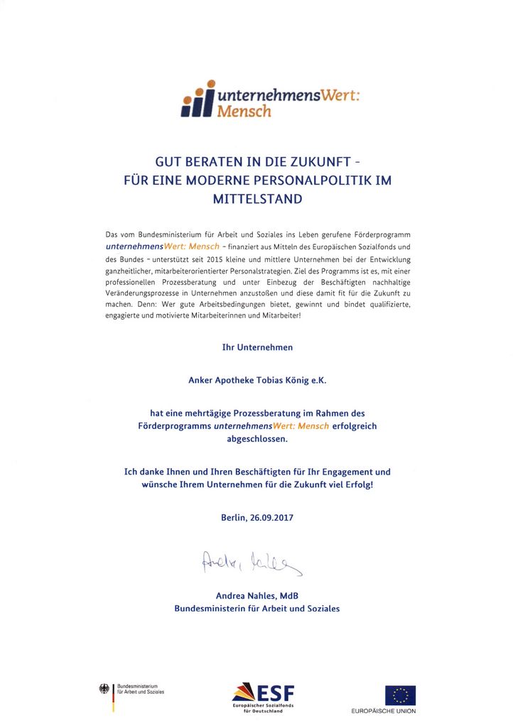 Mit professioneller Unterstützung und dem Einbezug unserer Mitarbeiter konnten wir in letzter Zeit zahlreiche positive Veränderungen der Arbeitsbedingungen in den KÖNIG APOTHEKEN erreichen. Hierfür haben wir von der Bundesministerin für Arbeit und Soziales, Frau Andrea Nahles, die Auszeichnung "UnternehmensWert: Mensch" erhalten. Das Bundesministerium für Arbeit und Soziales zeichnet seit 2015 kleine und mittlere Unternehmen für deren ganzheitliche, mitarbeiterorientierte Personalstrategie aus.